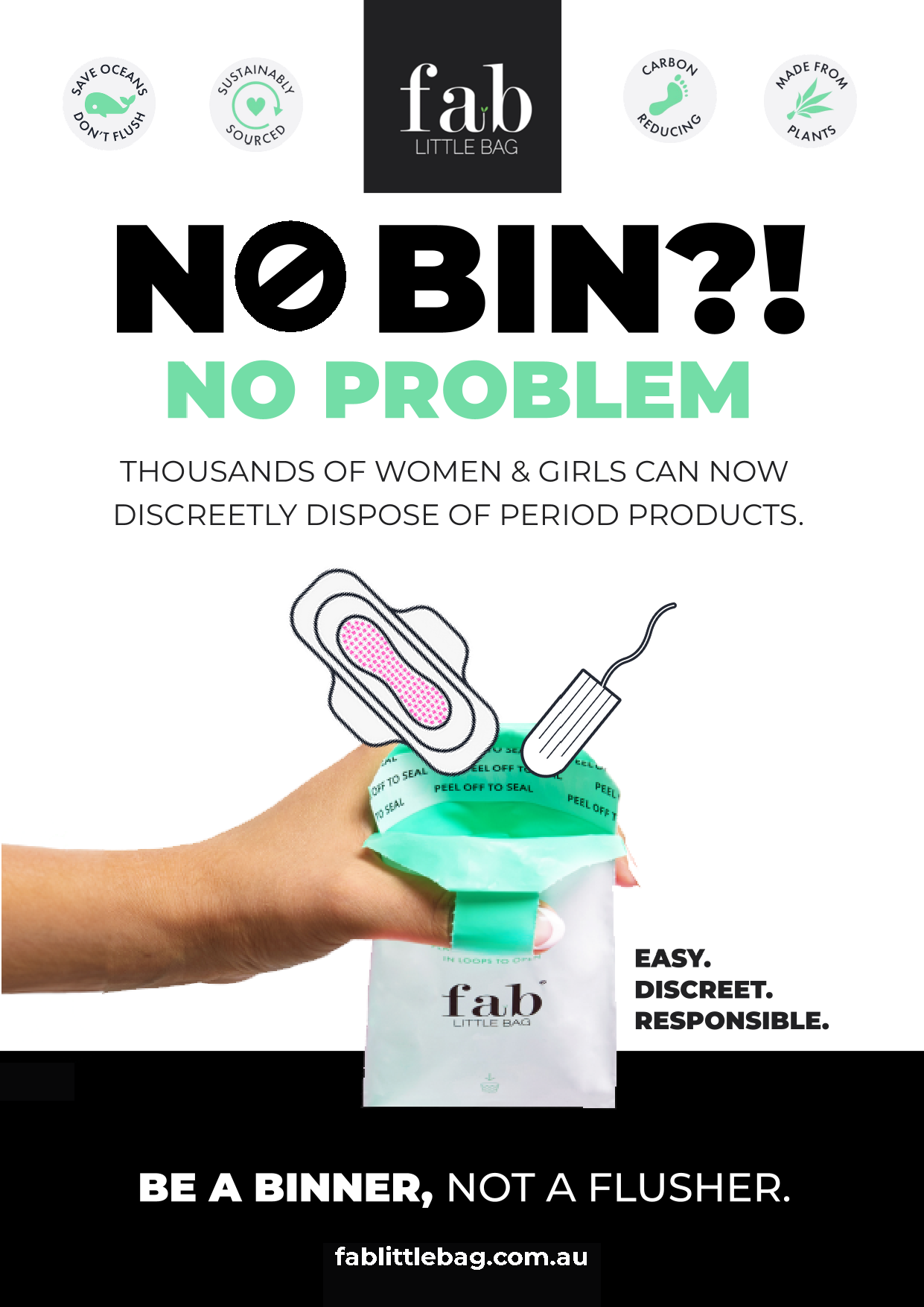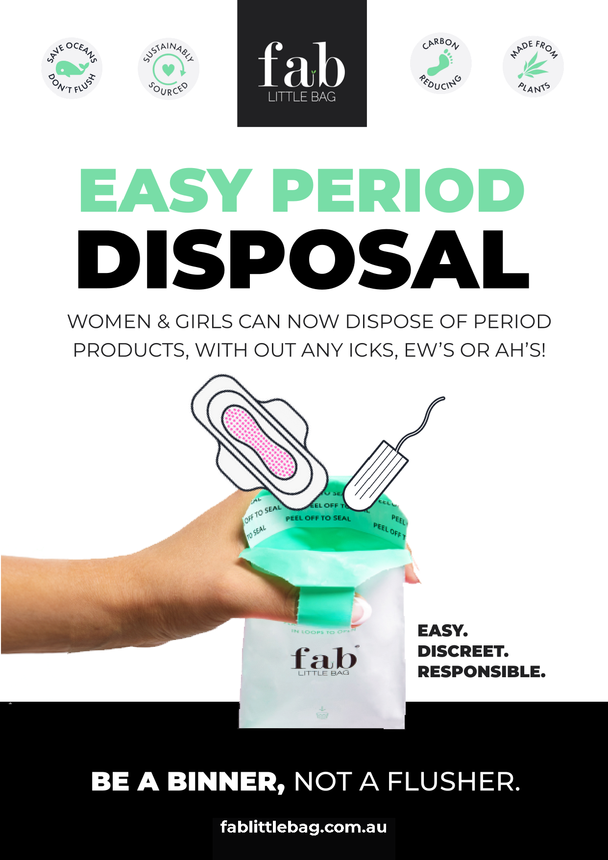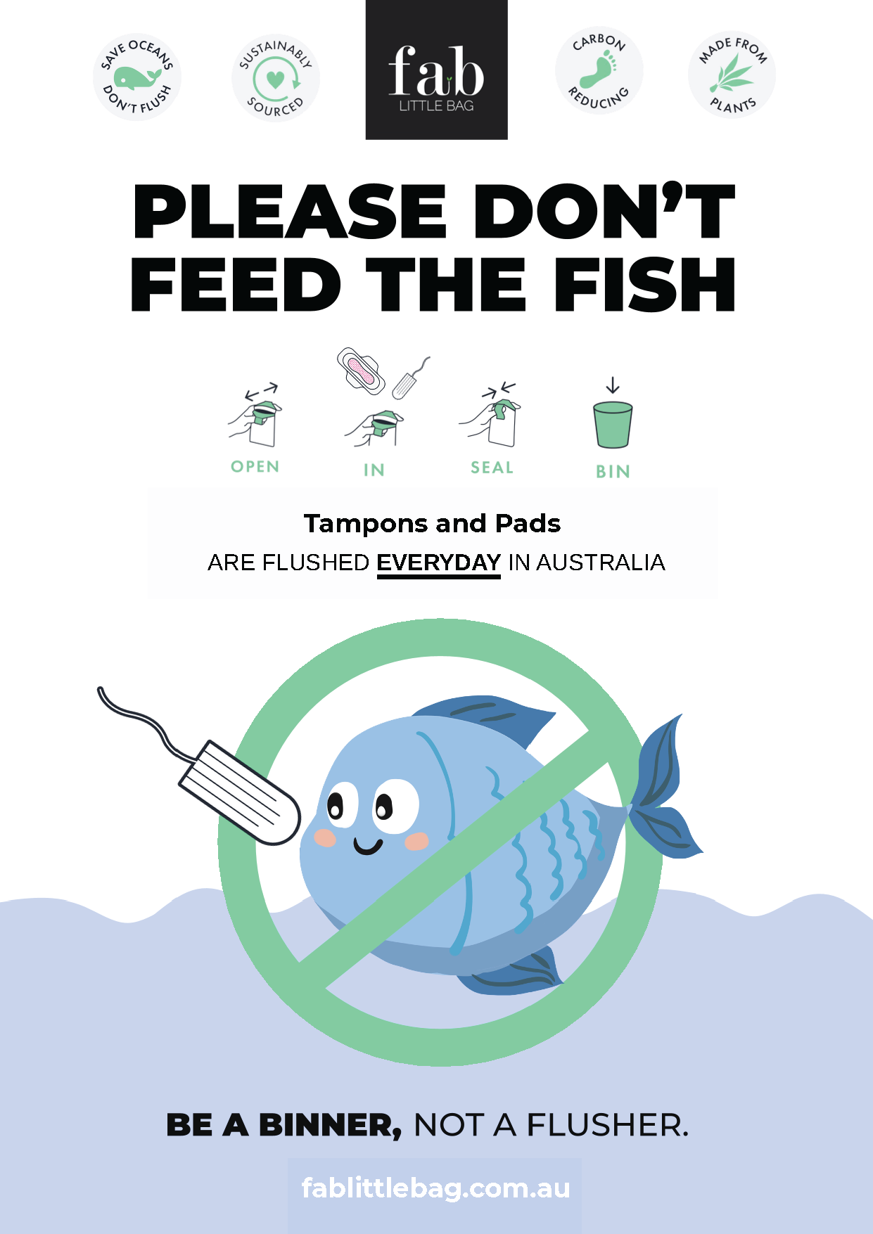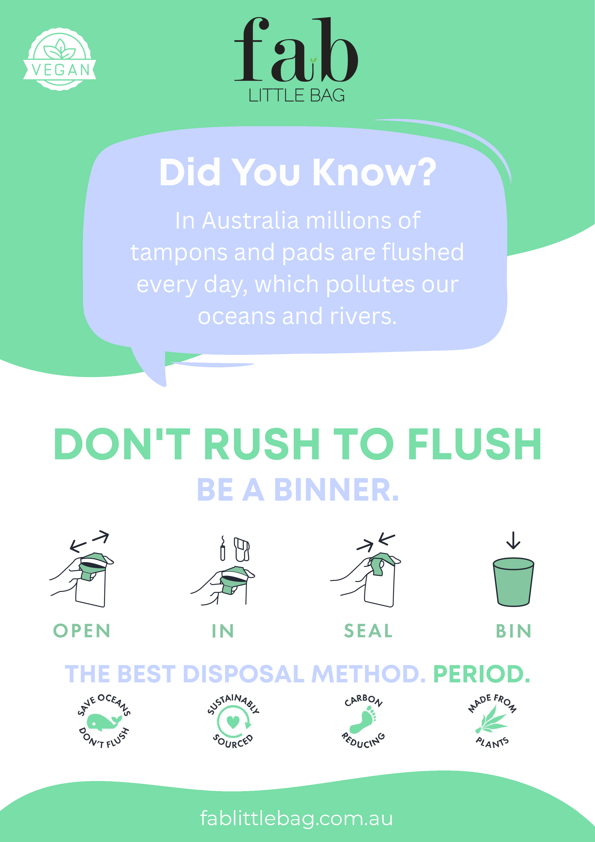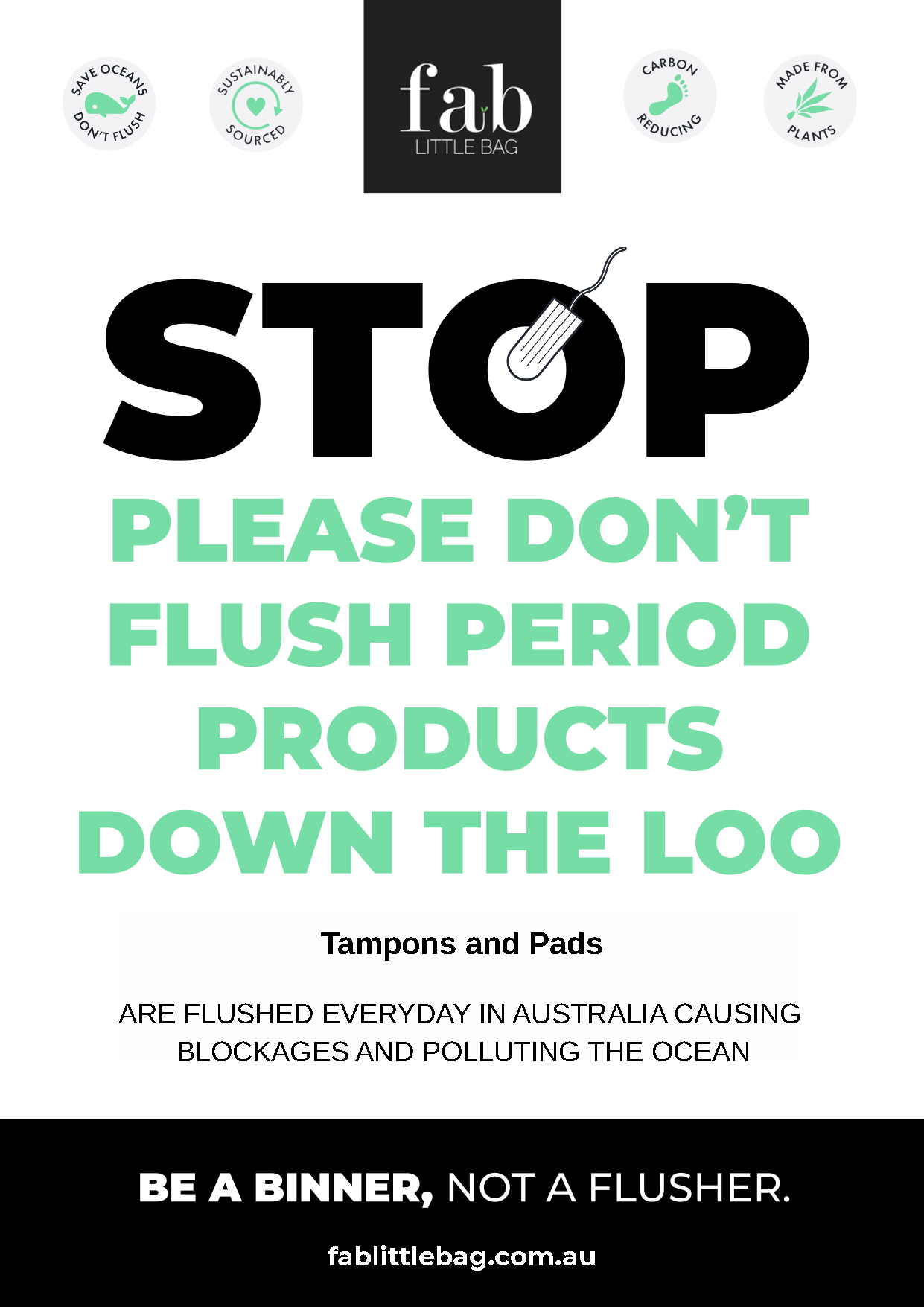 Use these informative graphics in your public spaces to show your customers your business is Period Support, and educate them on using FabLIttleBag. Simply right click and download your infographic, and print.